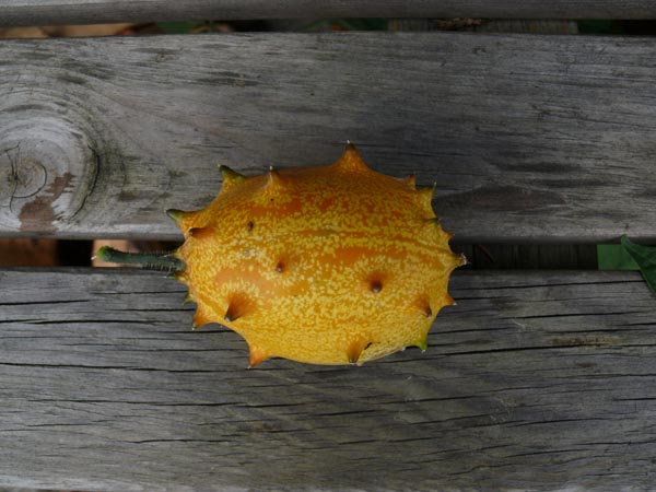 Ein rankender Exot für den Gewächshausanbau. Kiwanofrüchte sind oval und etwa 12 cm lang. Bei Reife färbt sich die Frucht orange. Gegessen wird das gallertartige Fruchtfleisch im Inneren. Durch Aussieben der Kerne erhöht man das Geschmackserlebnis. Bei Verwendung im Obstsalat kann man sich das Entfernen der Kerne sparen!