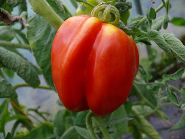 Rote, trockenfleischige, blockpaprikaartige Tomate mit hohlem Innenraum. Ideale Back- und Fülltomate.